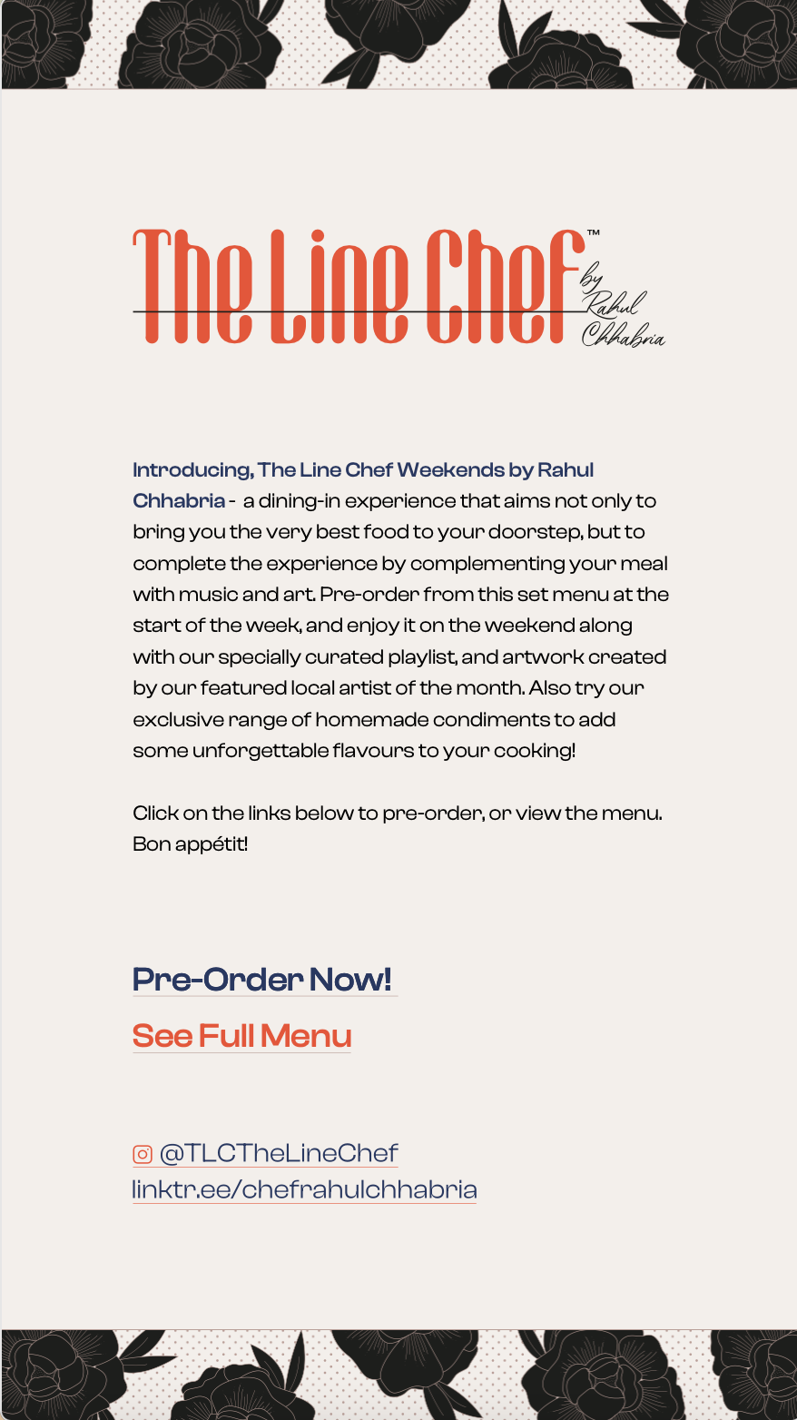 The Line Chef is a dining-in experience by Rahul Chhabria, a chef currently based in Mumbai, combining the very best food from his repertoire with music and art to create restaurant-like ambience even while eating at home.